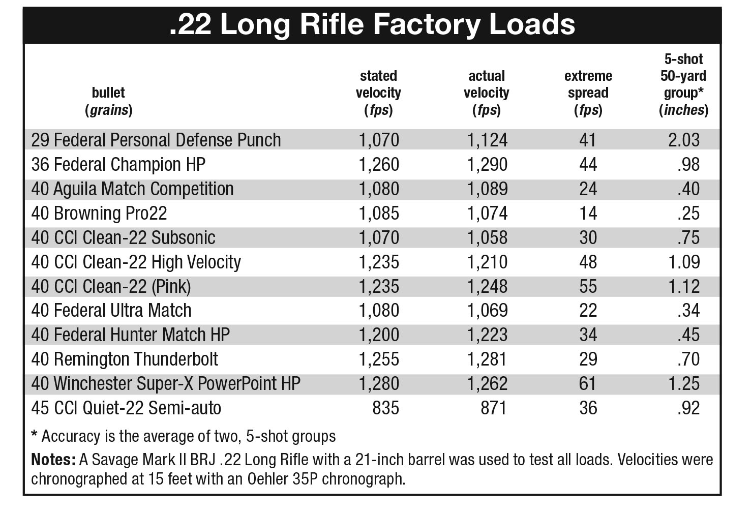 Federal also has a wide and useful selection of rimfire ammunition, and I’ve long relied upon their UltraMatch ammunition for its hairsplitting accuracy. I made sure that was included in the lot, as well as the similar 40-grain Hunter Match ammunition, which is loaded in nickel-plated cases. The classic Federal Champion ammunition uses a 36-grain copper-plated hollowpoint bullet, and has long been a serious performer, especially in bolt rifles. Rounding up the Federal representatives, their new Punch ammunition is designed as a self-defense round, but it shot very well from the Savage BRJ. Using a nickel-plated 29-grain bullet loaded in nickel cases at a sedate muzzle velocity 1,070 fps, the Punch stuff is a perfect choice for lighter game species.