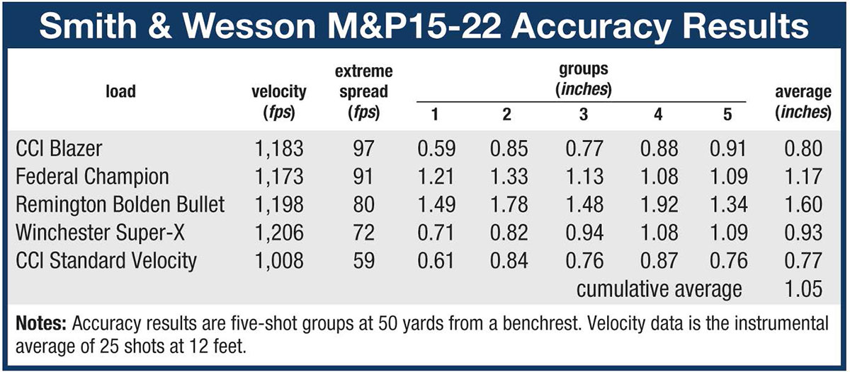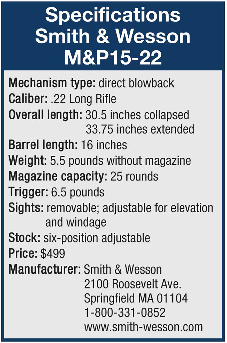 I try to be objective and unemotional with new guns, but this one sort of reached out, begging to be shot. In the first weeks I had it, well over 1,500 rounds went downrange without cleaning or a single gun-related stoppage. I have to be careful here, because there have been quite a few failures to fire with Remington bulk-packaged Golden Bullets but none with the other loads used. CCI Blazer has earned “favorite” status for reliability. There was also one stovepipe with standard velocity ammunition. Now, almost everyone recommends only high-velocity ammunition for stuff like this, but what kind of evaluator would I be if I only used recommended loads. Smith & Wesson reports that several endurance test models have exceeded 30,000 rounds. The little rifle carries S&W’s lifetime service policy.