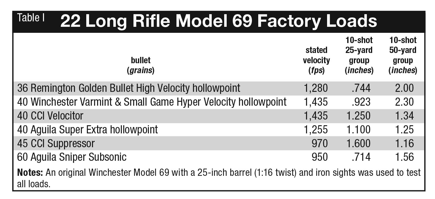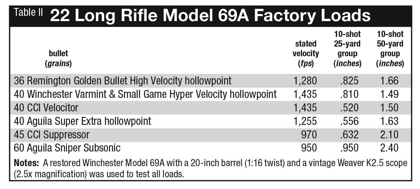 In addition to hunting ammunition, I brought along Aguila Sniper Subsonic to see, out of curiosity, how the ultra-heavy 60-grain bullets loaded in 22 Short cases would group in both rifles’ 1:16-inch twist. Wind is a daily factor here in the Arizona mountains, and yet the aperture-sighted Model 69 shot minute-of-ground-squirrel-head groups at 25 yards with hollowpoint ammunition, Remington’s 36-grain high-velocity hollowpoint Golden Bullet. If the rifle had provision for scope mounting, I’m confident it could shoot one-holers at 25 yards with its favorite 22 Long Rifle load, which is what the scoped Model 69A does with CCI Velocitor, CCI Suppressor and Aguila Super Extra hollowpoint, all hollowpoint hunting ammunition, and its 50-yard groups would be halved. By comparison, I have modern 22 Long Rifle guns that don’t shoot one-hole, 10-round groups with three different brands of hunting ammunition.