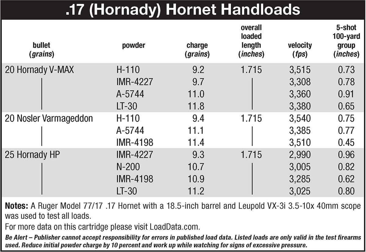 Norma 200 is a powder I had hanging around for use in the 375 Holland & Holland Magnum with lighter bullets and it handles that job wonderfully. The small grain size is a great choice for the 17 Hornet, as 10.7 grains under the 25-grain Hornady hollowpoint produced a muzzle velocity of 3,005 fps. Five-shot groups measured .82 inch.