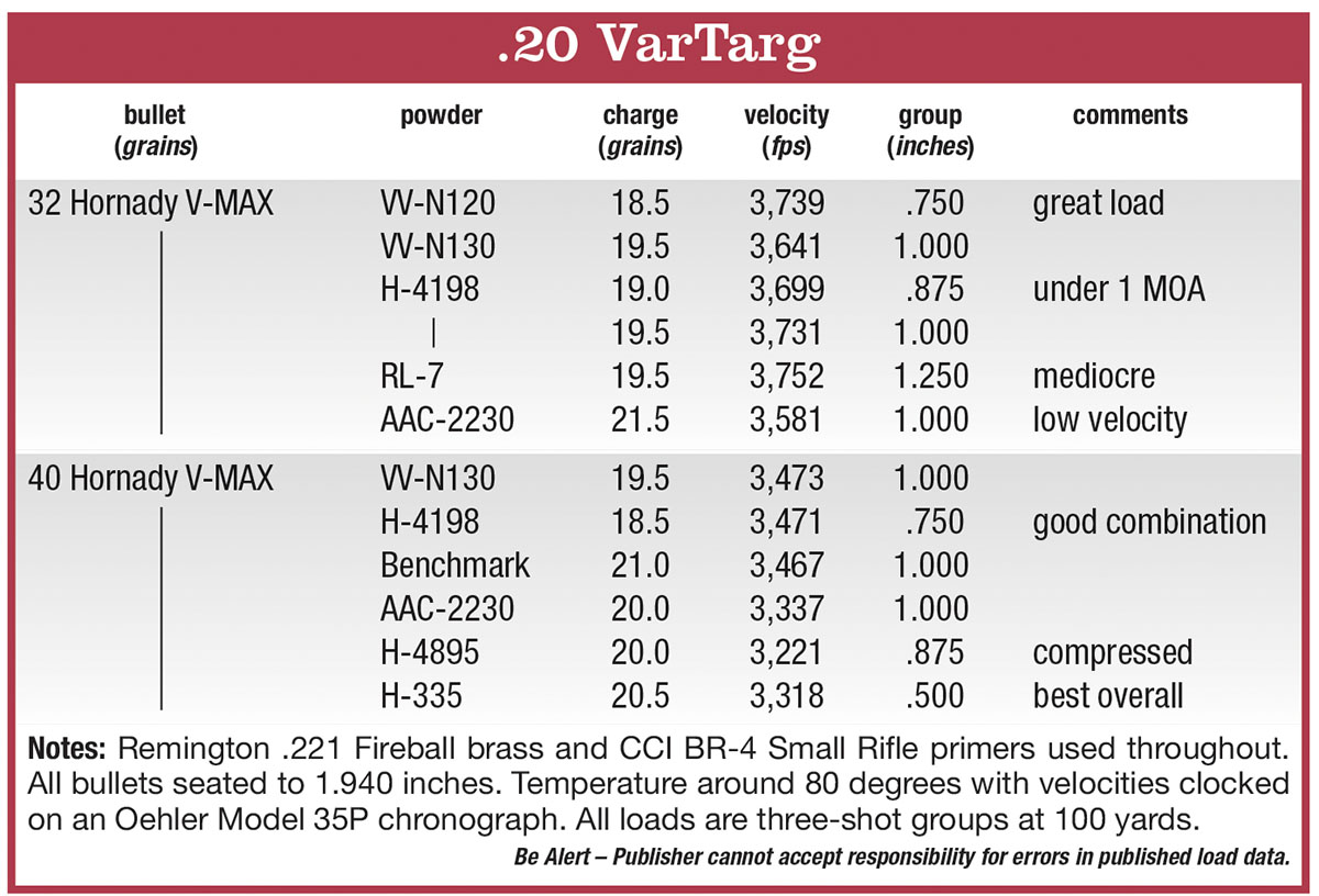 Briefly, I like the .20 VarTarg. It was a challenge to gather all the parts to make this .20-caliber cartridge a reality, and I’m not finished yet. Most of the shooting came at the end of summer, so I have the cooler weather to do more in the way of research and testing of this very interesting wildcat. I look forward to it.
