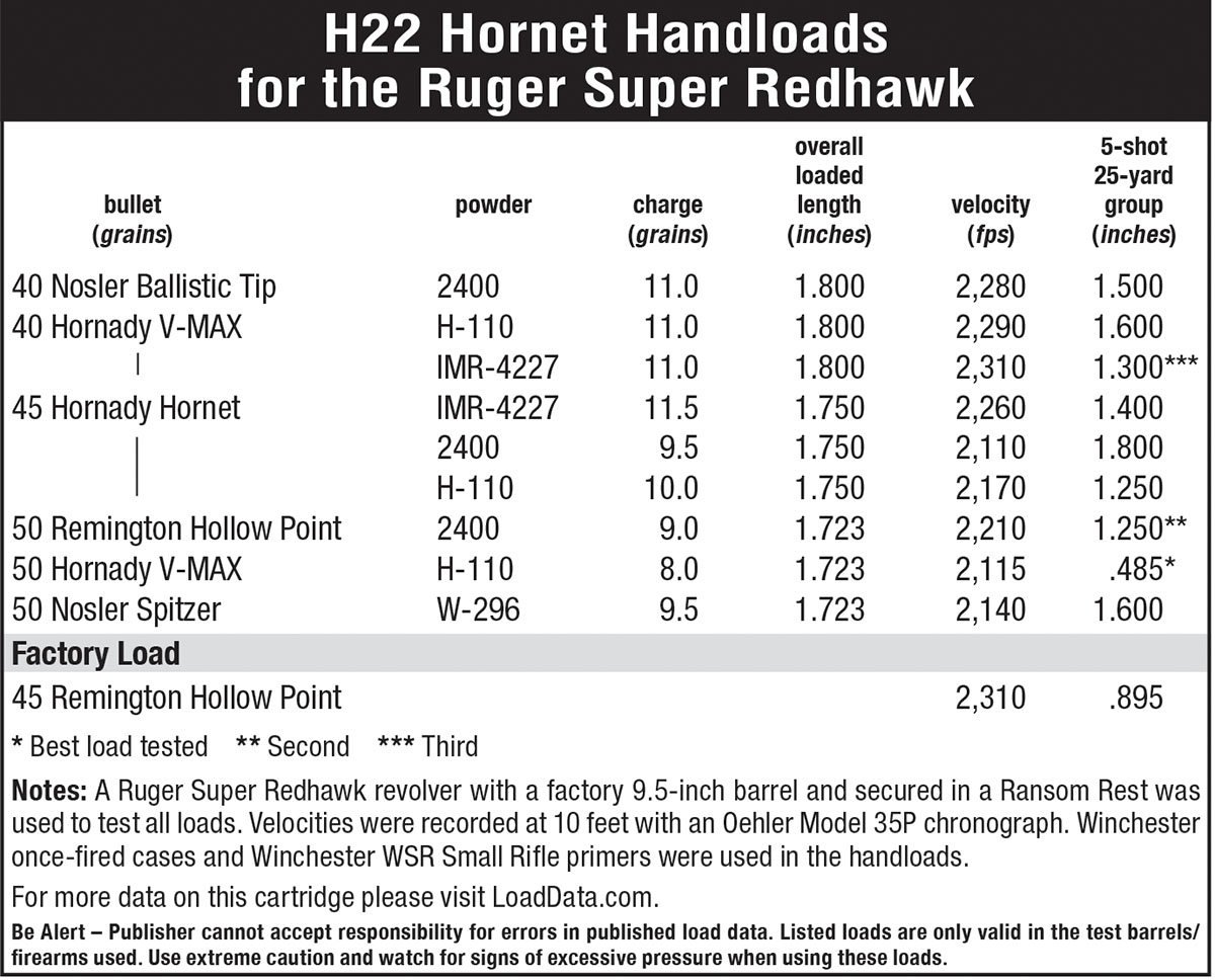 With only a few years to go before hitting its 100th birthday, the 22 Hornet has the power to make the grade with small-game hunters everywhere. Plus, with the introduction of the beefy Ruger Super Redhawk chambered for the 22 Hornet, the beat goes on! A direct descendent of the Redhawk, the gun was built to comfortably shoot some of the most powerful cartridges man can come up with. To this end, the gun was offered in the 10mm, 44 Magnum, 454 Casull and the 480 Ruger in a variety of models and barrel lengths.