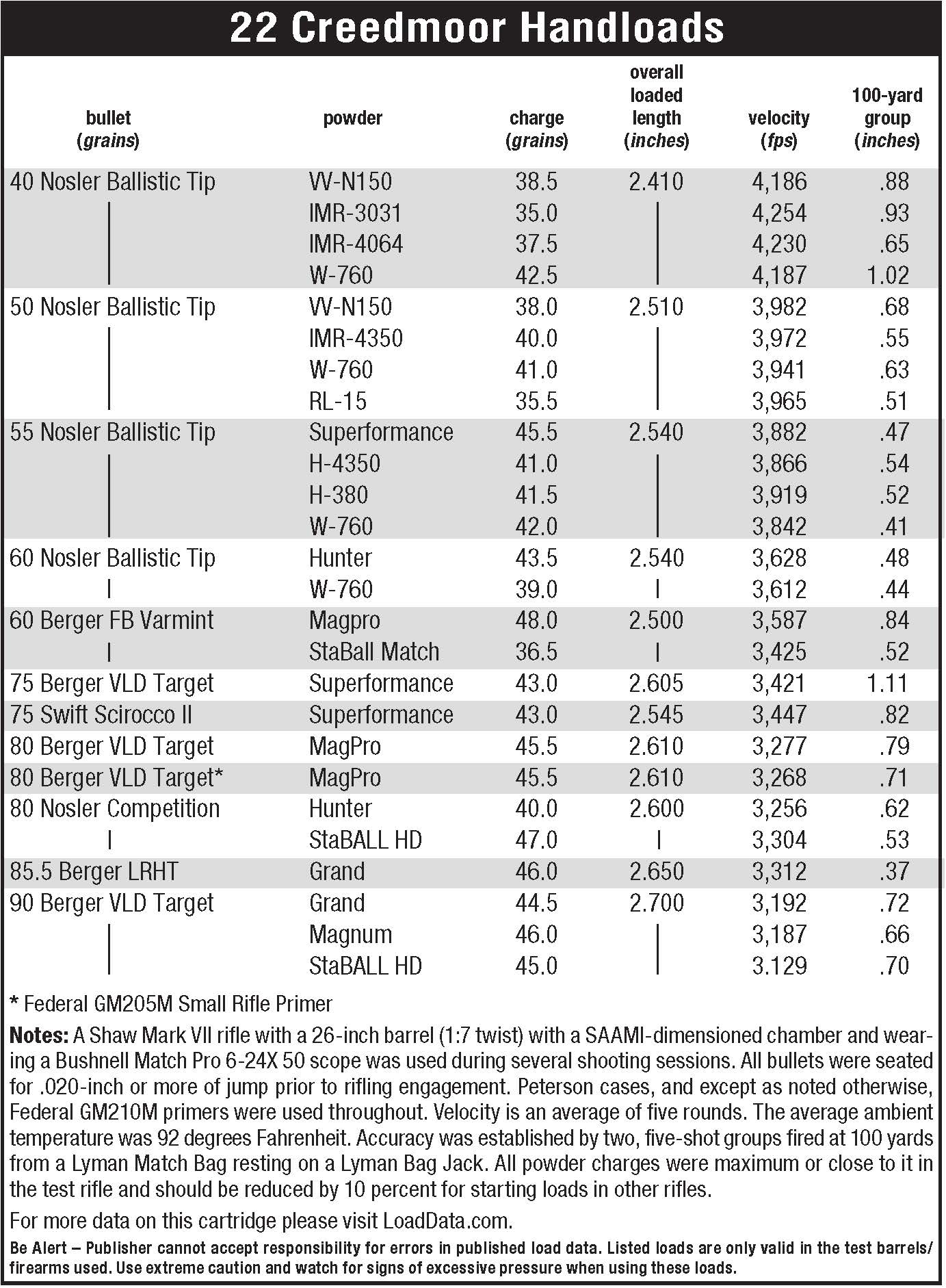 Peterson offers the 22 Creedmoor case pocketed for Large Rifle or Small Rifle primers. Since some long-distance competitors commonly use magnum-force primers in the 22 Creedmoor and other relatively small cartridges such as the 6mm Dasher and 6.5x47mm Lapua, I tried the Federal GM210M and the GM205M with the MagPro/Berger 80 VLD combination. From my Shaw rifle on an extremely hot day, there was very little difference in accuracy and velocity.