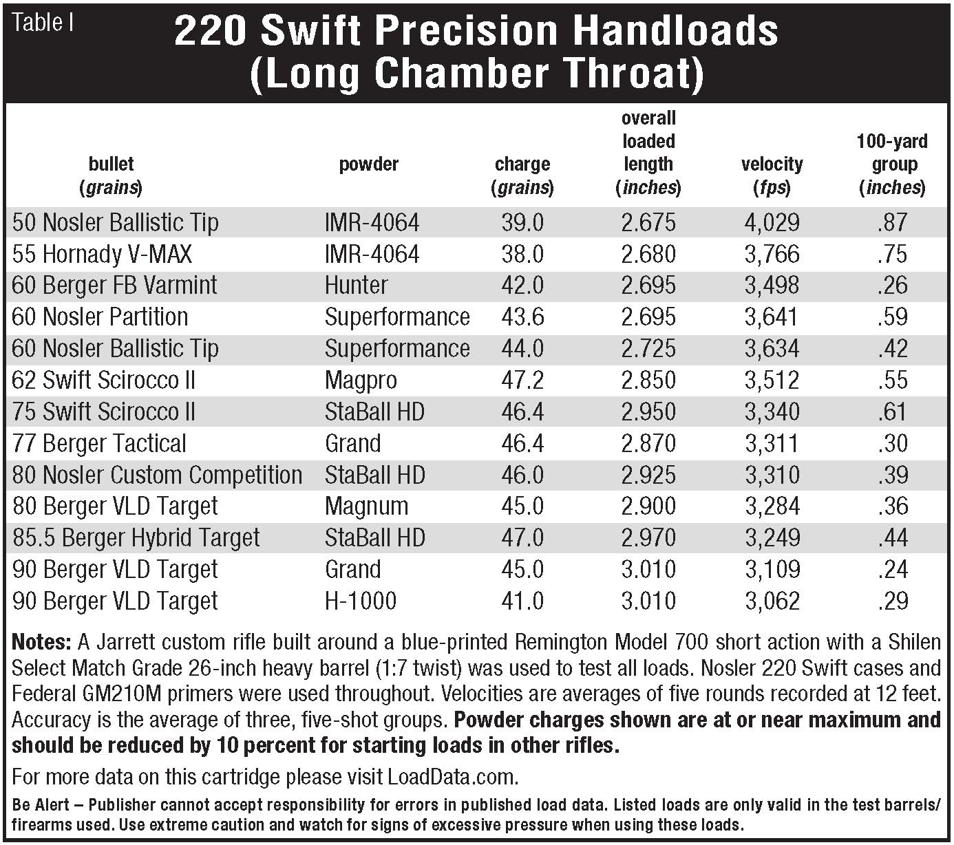 Despite being 89 years young and lacking what some shooters consider to be a modern shape, the 220 Swift is still popular enough for Nosler, Federal, Hornady, HSM and Remington to continue loading with a variety of bullet weights and styles. Shown here is a load used by Layne over the years to take a few deer.