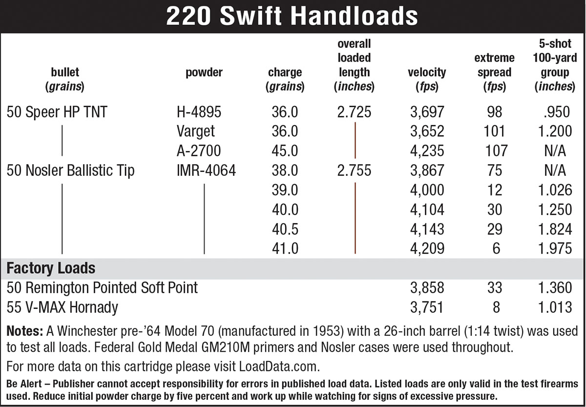 Working with an 88-year old cartridge in a 70-year old rifle, using one powder (IMR-4064) that is 85 years old and another (H-4895) almost as ancient, and getting the results I did, says a great deal about the rifles Winchester was making in the early 1950s. It also says a lot about the 220 Swift.
