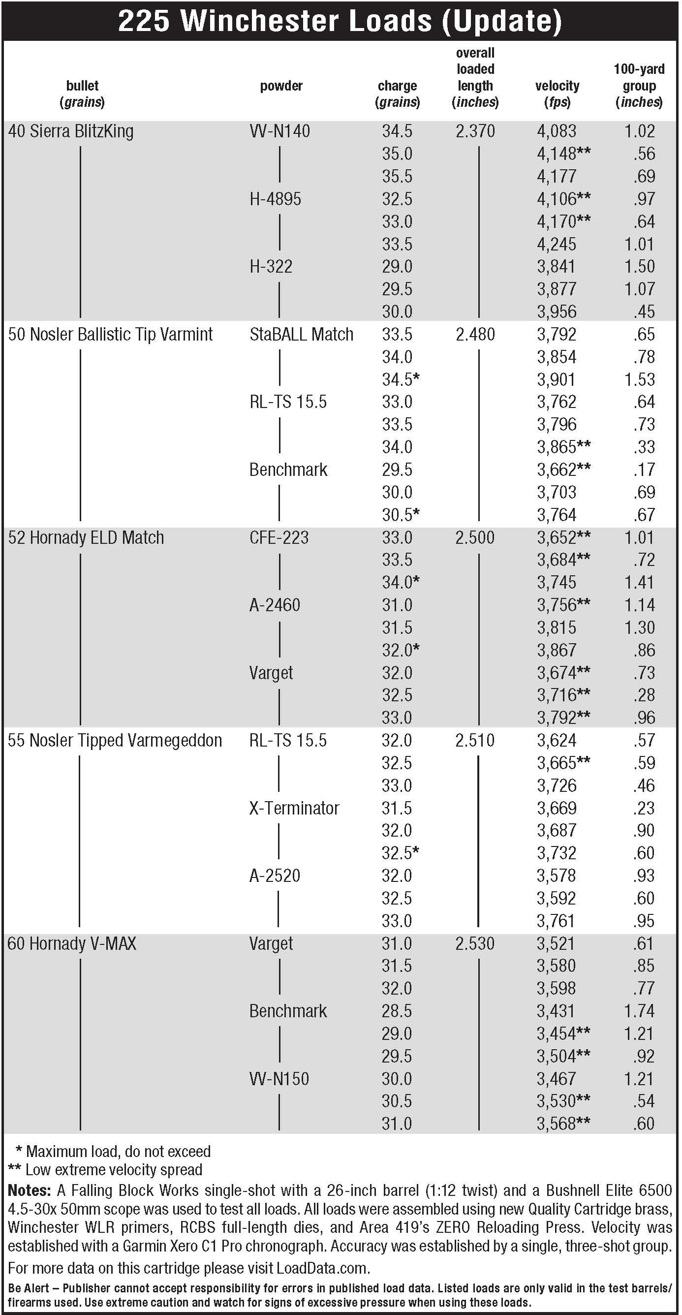 I’ve discovered that several modern powders and my rifle’s 26-inch barrel allow the 225 Winchester to match published 22-250 Remington velocities, though this isn’t necessary. The 225 Winchester provides all the usable velocity any varmint shooter could ask for. My determination to introduce modern temperature-stable, de-coppering powders became an exercise in extrapolation based on published 22-250 Remington data. In at least a few cases, this required returning to the loading bench, de-milling loaded ammunition, and throttling things back a touch. Several of the listed maximum loads are still pretty spicy, so as always, start with the listed start loads and work up cautiously. Again, there is no real reason to push velocity as far as I did in many cases; loads a grain or two under even my start loads are quite viable. There is no trouble finding dies, an RCBS full-length sizing set was used here.
