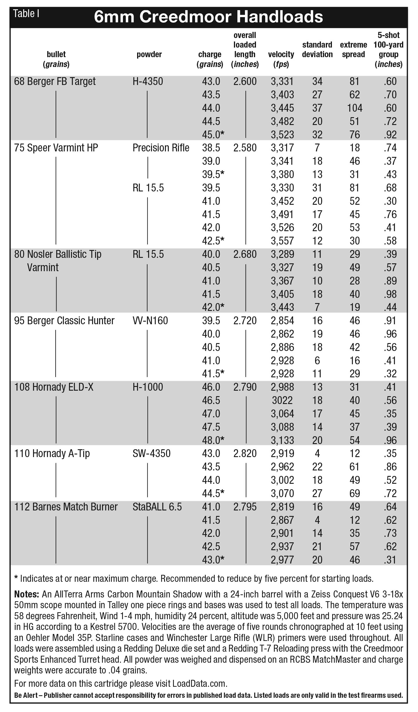 After reviewing several cartridges, I settled on 6mm Creedmoor for a variety of reasons, barrel life would be respectable, provided the barrel was not abused. Velocity is respectable and allows for good bullet performance and energy figures at extended ranges. Components are readily available given the popularity of the Creedmoor cartridges along with the capability to shoot heavy, higher-BC bullets for larger game, if need be, was the final deciding factor. It is adequate for deer with proper shot placement and good bullet construction. It mimics the ballistics of the 243 Winchester, a cartridge most folks are familiar with.