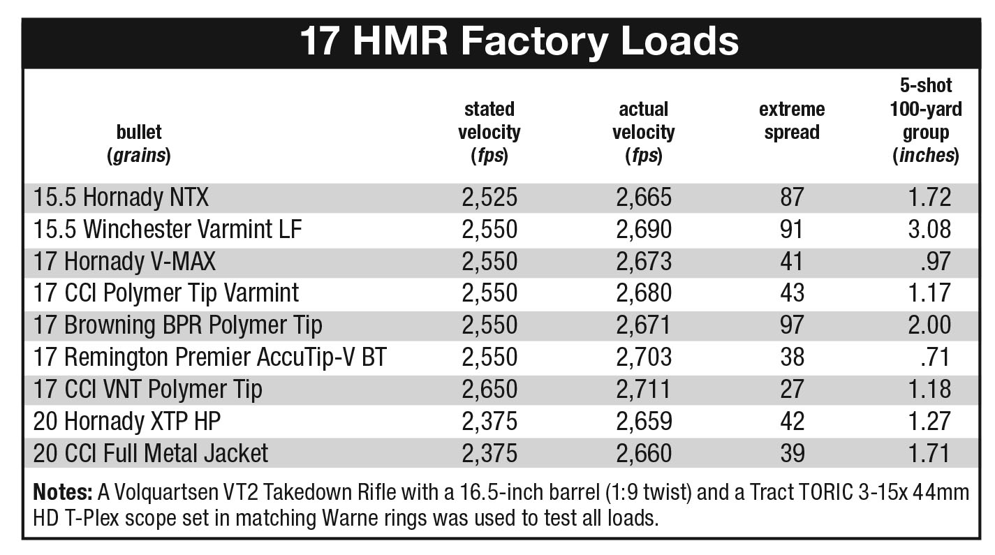 The light, nontoxic loads included Hornady’s 15.5 NTX (Varmint Express Rimfire) and Winchester’s 15.5-grain Varmint LF (Lead-Free). The heavier 20-grain loads consisted of Hornady XTP hollowpoints and CCI Full Metal Jackets. Standard 17-grain ammunition included Hornady’s V-MAX, CCI’s Polymer Tip Varmint and VNT Polymer Tip, Browning BPR Polymer Tip and Remington’s Premier AccuTip-V BT. That’s as good a cross section of Hummer ammunition as you will find today.